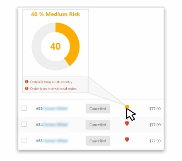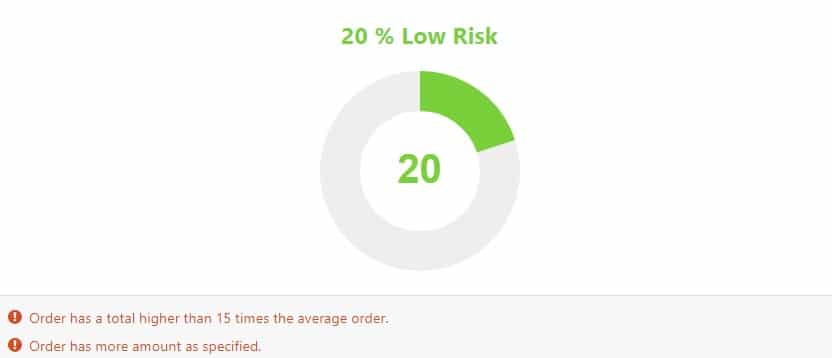 WooCommerce Anti-Fraud بصورت خودکار نمره ای از ۱۰۰ به هر سفارش می دهد. به این نمره ریسک گفته می شود. هرچه تعداد بیشتر باشد، احتمال تقلب در سفارش بیشتر است. بررسی نمره ریسک به شما امکان می دهد تا به سرعت سطح بالقوه ریسک معامله را ارزیابی کرده و مطابق آن عمل کنید. نمره ریسک و توصیه برای سفارش از طریق ادمین ووکامرس داده می شود.