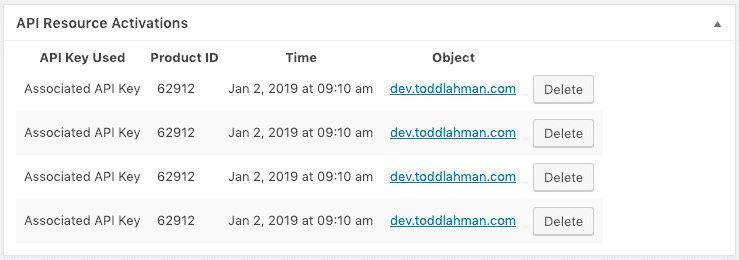در صفحه حساب من> کلیدهای API، کلید Master API همیشه لیست شده است. جزئیات باقیمانده می تواند به صورت اختیاری Product Order API Key را لیست کند، یا می تواند همانطور که در این تصویر نشان داده شده پنهان شود. مشتری می تواند فعال سازی هایی را که توسط نرم افزار سرویس گیرنده به درستی حذف نشده اند را در داشبورد حذف کند.